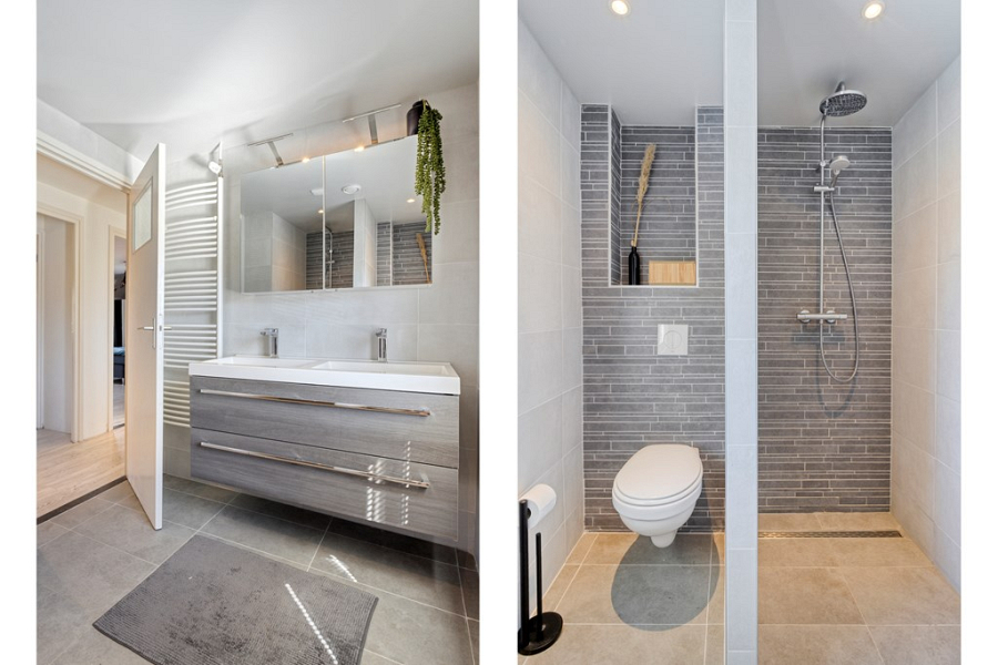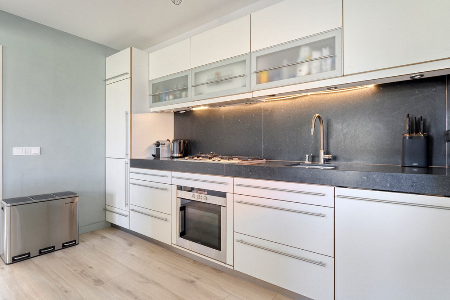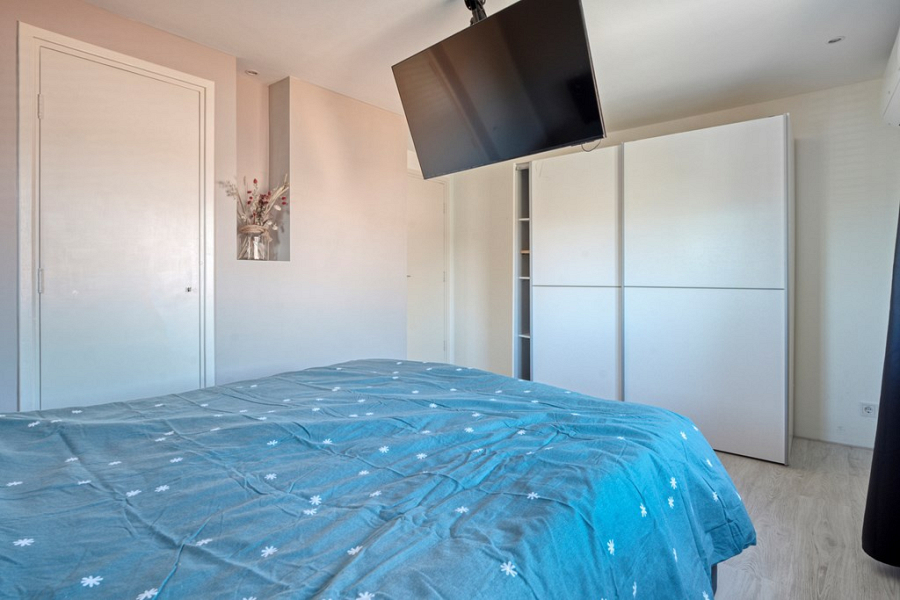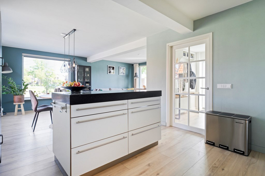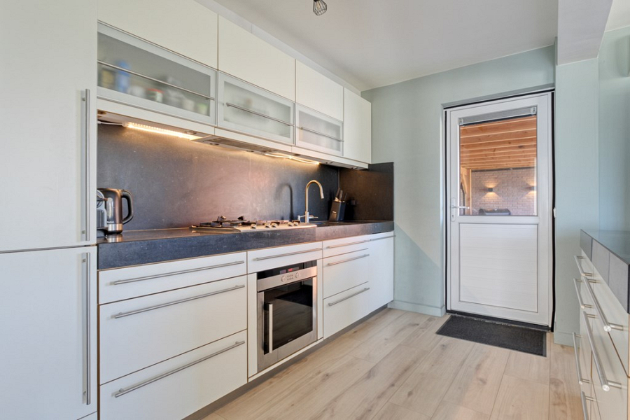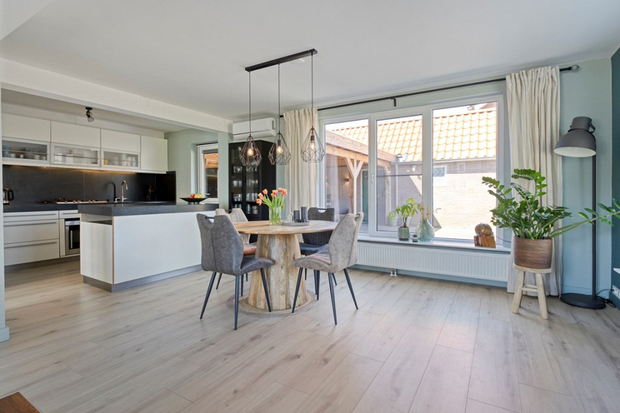 De woonkamer en keuken zijn volledig opnieuw ingedeeld, waardoor een fijne open leefruimte is ontstaan met veel lichtinval. Deze ruimte biedt genoeg plek voor een gezellige zithoek en eettafel, mét airconditioning voor extra comfort, ideaal tijdens warme zomerdagen. De moderne open keuken is van alle gemakken voorzien, inclusief een schiereiland dat niet alleen praktisch is, maar ook gezellig voor een borrel of gezellige kookmomenten met vrienden en familie. Hier vind je een koelkast met vriezer, gaskookplaat, oven, vaatwasser en voldoende bergruimte.