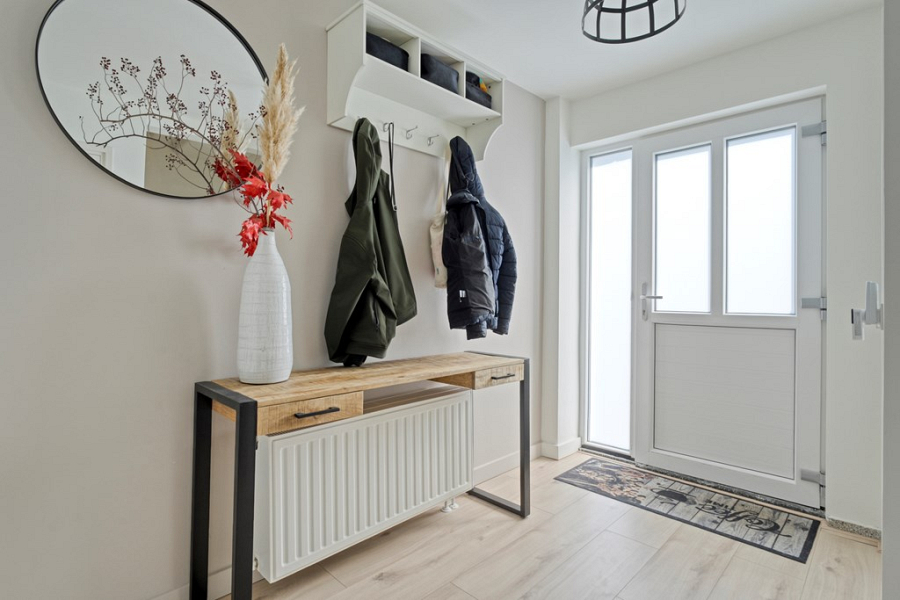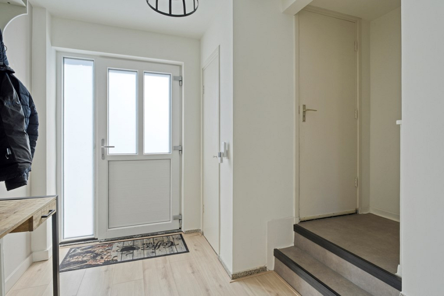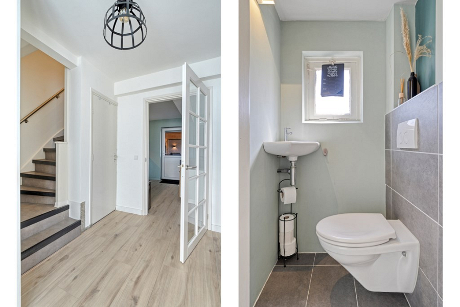 Je komt binnen in een ruime hal met meterkast, modern toilet en toegang tot een verrassend ruime kelder – ideaal als voorraadruimte of voor wijnopslag.
