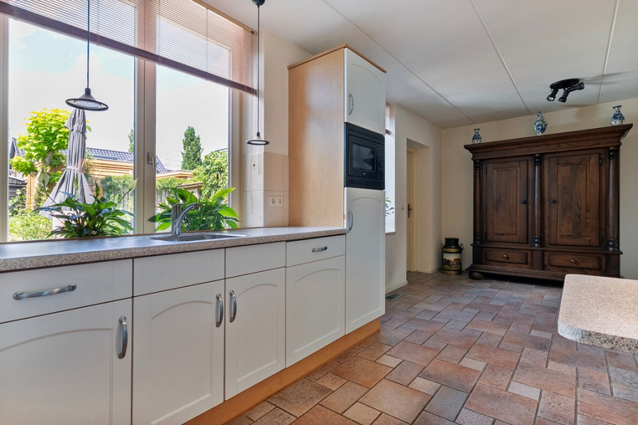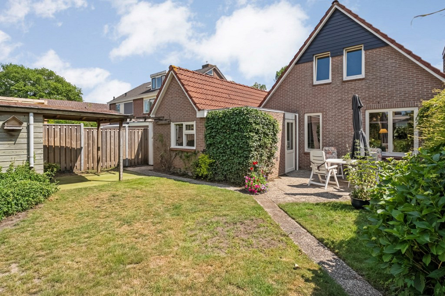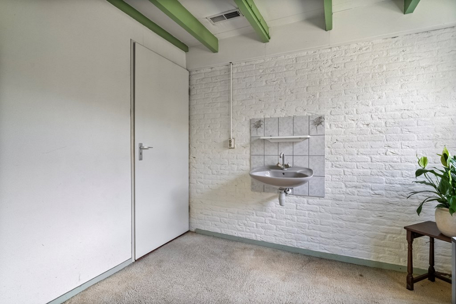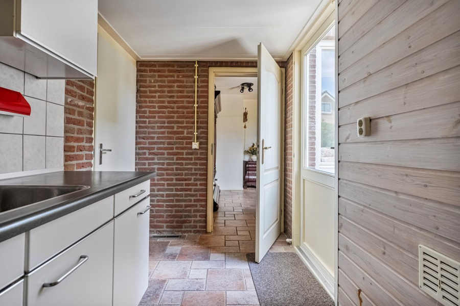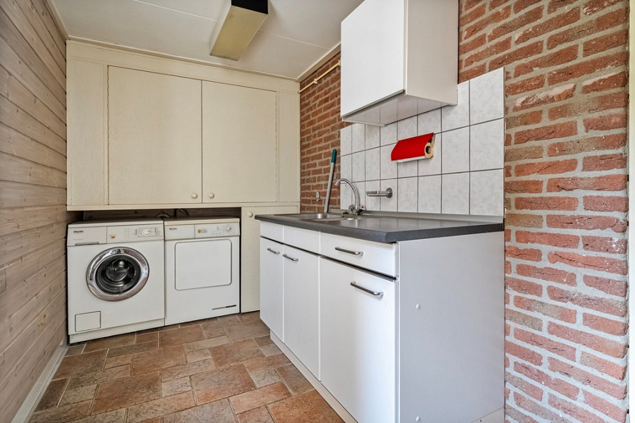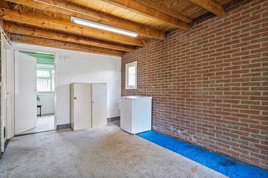 Praktisch is ook de ruime bijkeuken, met een keukenblok en witgoedaansluitingen. Vanuit hier heb je toegang tot de achtertuin én tot de aangebouwde garage, die is opgedeeld in een garagegedeelte en een aparte kantoorruimte – ideaal voor thuiswerkers of een praktijk aan huis. Extra handig: de garage beschikt over een vliering, bereikbaar via een vlizotrap, die zorgt voor nog meer bergruimte.