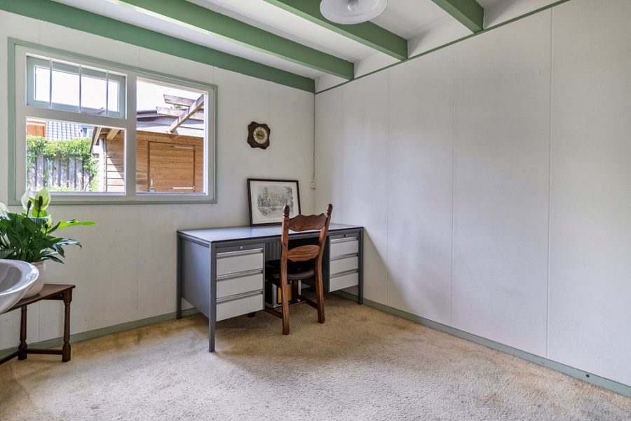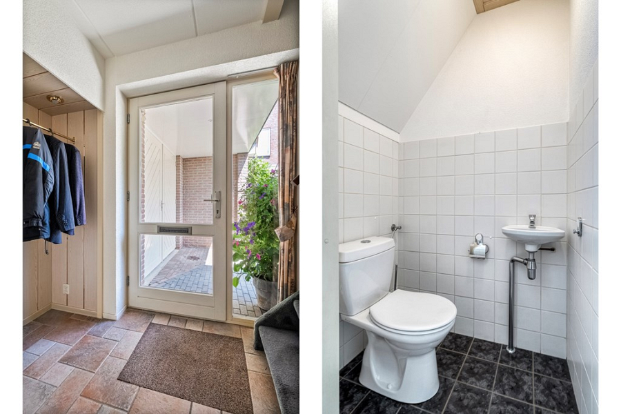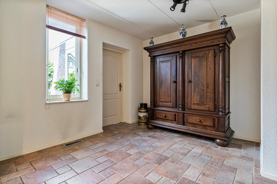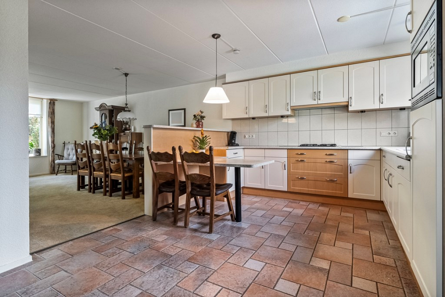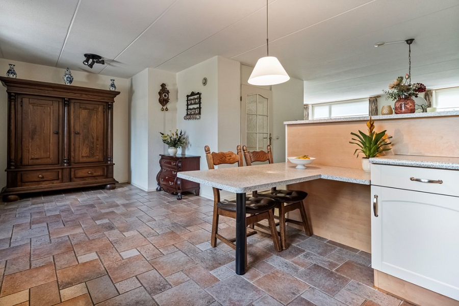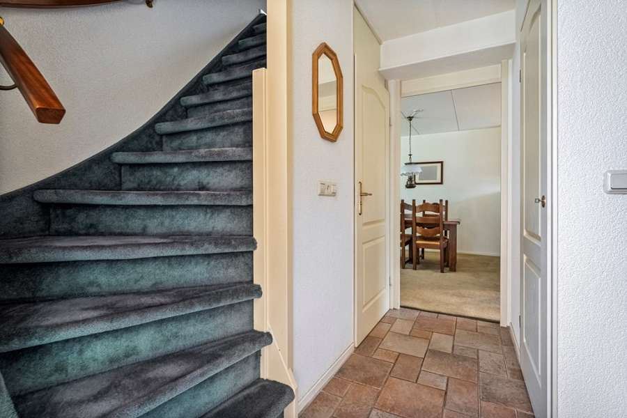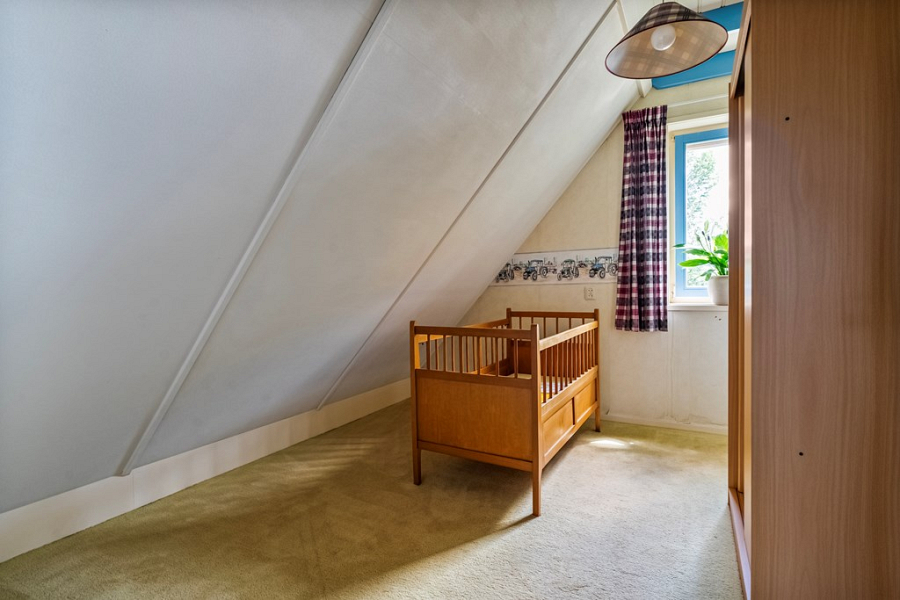 Praktisch is ook de ruime bijkeuken, met een keukenblok en witgoedaansluitingen. Vanuit hier heb je toegang tot de achtertuin én tot de aangebouwde garage, die is opgedeeld in een garagegedeelte en een aparte kantoorruimte – ideaal voor thuiswerkers of een praktijk aan huis. Extra handig: de garage beschikt over een vliering, bereikbaar via een vlizotrap, die zorgt voor nog meer bergruimte.