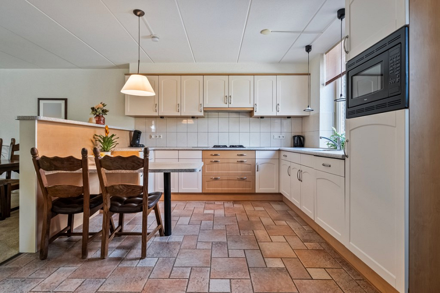 Via de entree kom je in de hal met meterkast, trapopgang, garderobe en het toilet. De woonkamer is licht en uitnodigend, met grote ramen en een open, ontspannen sfeer. Aansluitend vind je de halfopen keuken, voorzien van een eigentijdse opstelling met gaskookplaat, afzuigkap, magnetron, koelkast, vaatwasser en veel bergruimte.