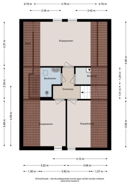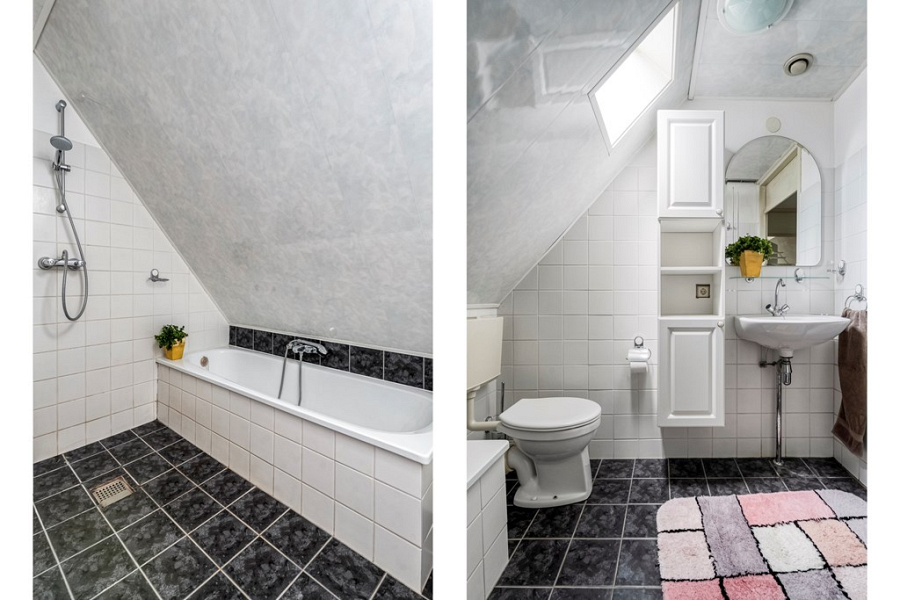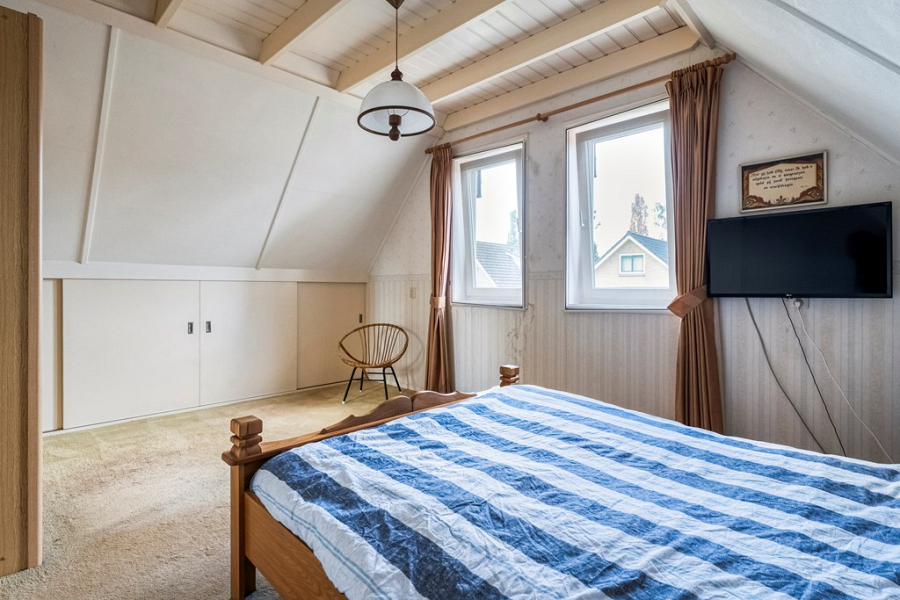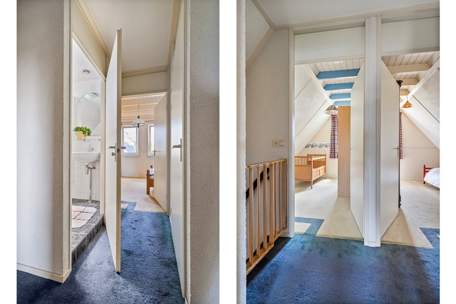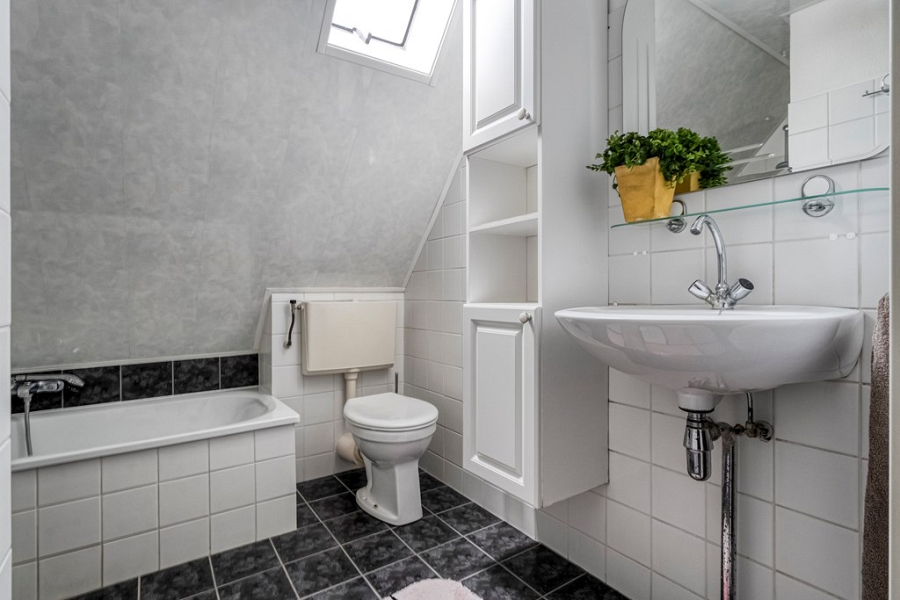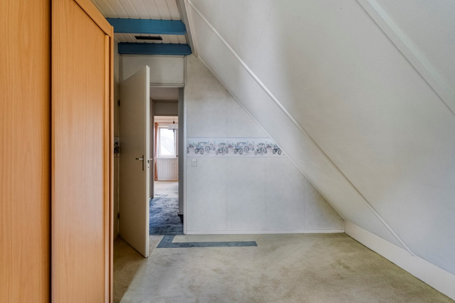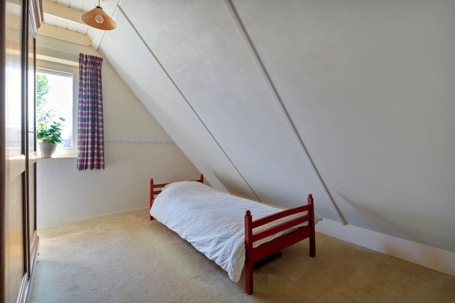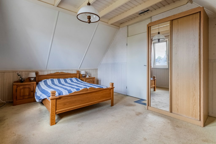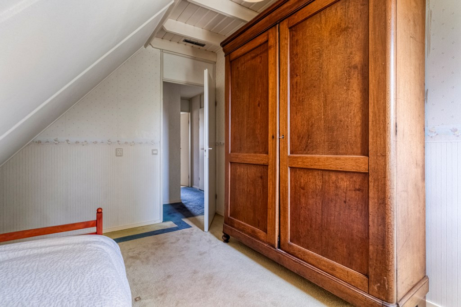Op de eerste verdieping vind je drie slaapkamers, waarvan twee aan de voorzijde. Oorspronkelijk vormden deze één grote kamer, maar ze zijn opgedeeld tot twee afzonderlijke slaapkamer, ideaal voor bijvoorbeeld kinderen, logees of een werkplek. Aan de achterzijde bevindt zich de ruime ouderslaapkamer. De badkamer bevindt zich in het midden van de woning en is compleet uitgerust met een douche, ligbad, tweede toilet en wastafel. Via de overloop heb je bovendien toegang tot de technische ruimte, waar zich de opstelling bevindt voor de heteluchtverwarming met warmteterugwin-unit (WTW) en de geiser voor warm water.
