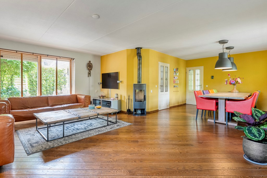 De royale en lichte woonkamer is voorzien van een sfeervolle speksteenkachel, eiken houten vloer en een schuifpui naar de tuin, waardoor je hier volop geniet van het binnen-buitengevoel. Er is meer dan genoeg ruimte voor een gezellige zithoek en een grote eettafel, perfect voor lange avonden met familie en vrienden.
