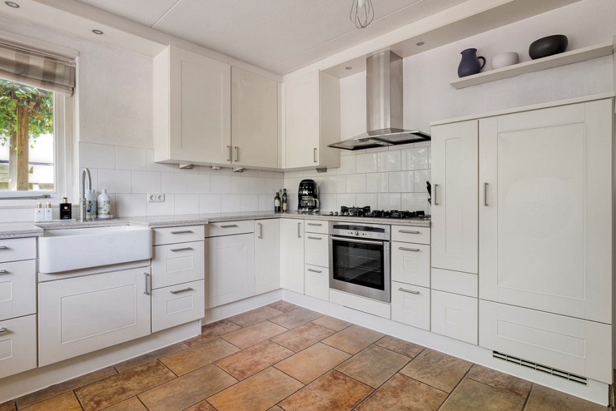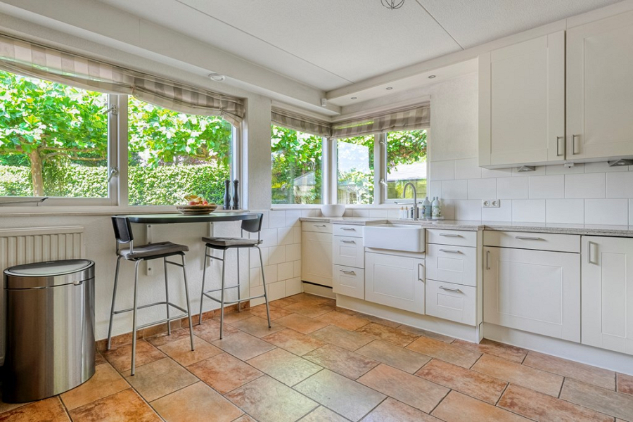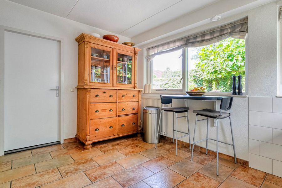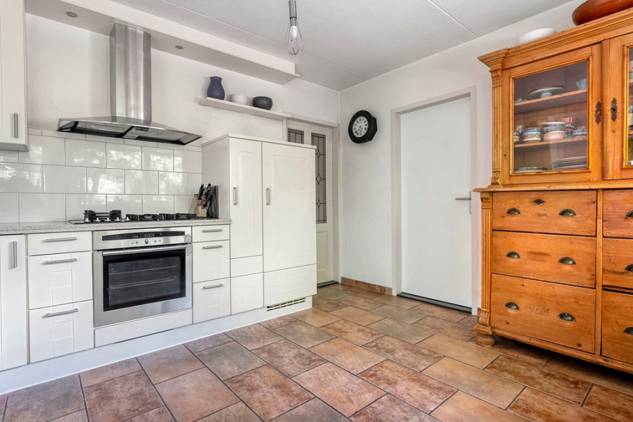 Aan de achterzijde van de woning ligt de dichte keuken, met uitzicht op de tuin. De keuken is functioneel en voorzien van diverse inbouwapparatuur en biedt volop mogelijkheden om deze geheel naar eigen smaak en stijl te moderniseren.