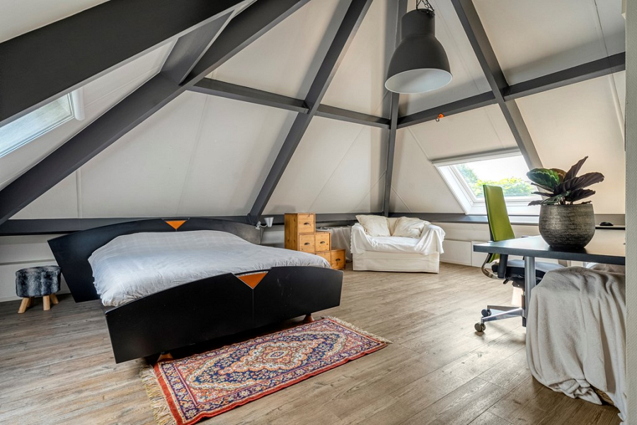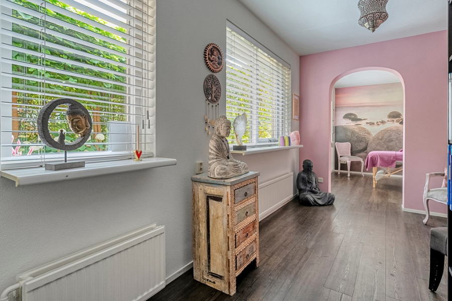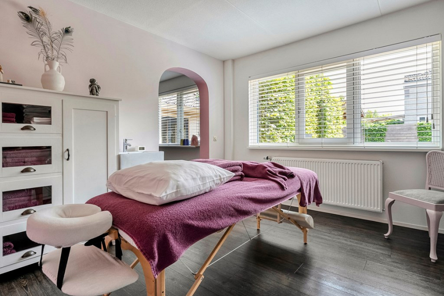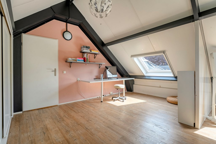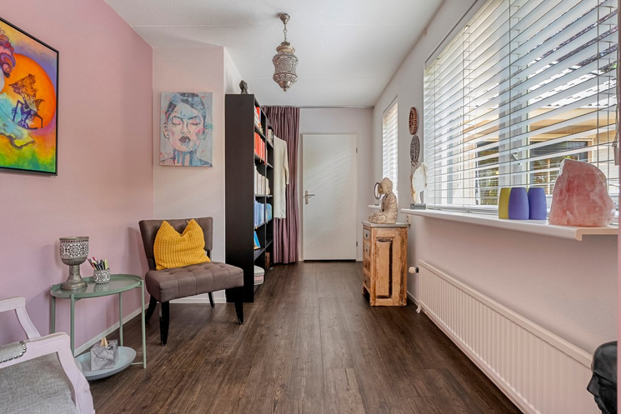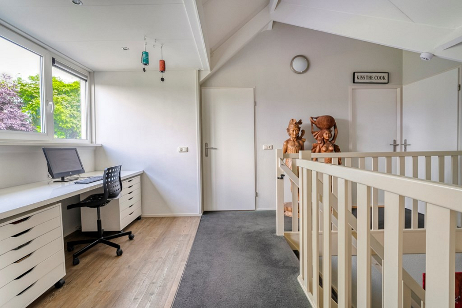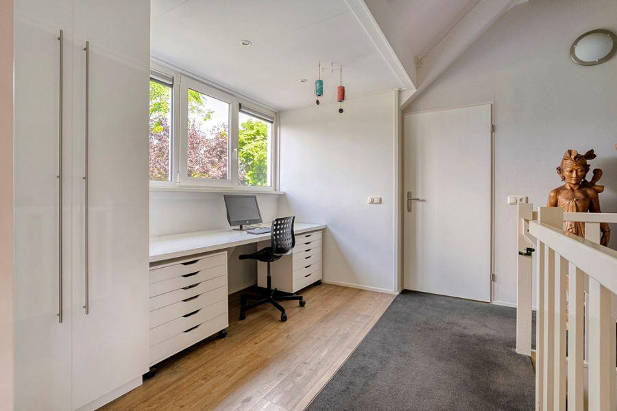 De voormalige garage is op de begane grond omgebouwd tot een volledig geïsoleerde en verwarmde praktijkruimte. Deze ruimte is ideaal als salon, atelier, praktijk aan huis of creatieve werkplek, maar kan uiteraard ook dienen als slaapkamer. Kortom een multifunctionele ruimte. Op de verdieping van de voormalige garage is bovendien een extra kantoorruimte met dakkapel gerealiseerd, bereikbaar via een eigen ingang aan de achterzijde van de woning. Hierdoor kun je klanten of bezoekers volledig onafhankelijk ontvangen. Deze ruimte is ook perfect te gebruiken als zelfstandige werkplek of als extra slaapkamer, bijvoorbeeld voor een thuiswonende student die graag wat meer privacy wil.
