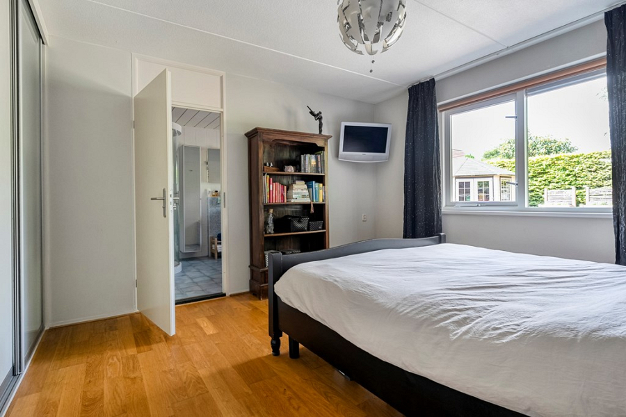 Via de woonkamer ga je terug naar de hal. Via de hal bereik je de royale slaapkamer op de begane grond, waardoor de woning levensloopbestendig is. Deze slaapkamer beschikt over een zeer ruime badkamer, compleet uitgerust met een toilet, een hoekbad, een aparte douchehoek en een wastafel. De badkamer is functioneel en voor wie dat wil, zijn er in de toekomst volop mogelijkheden om deze ruimtes te moderniseren. Maar zo geniet je van alle comfort op één verdieping en kun je hier met gemak en plezier blijven wonen.