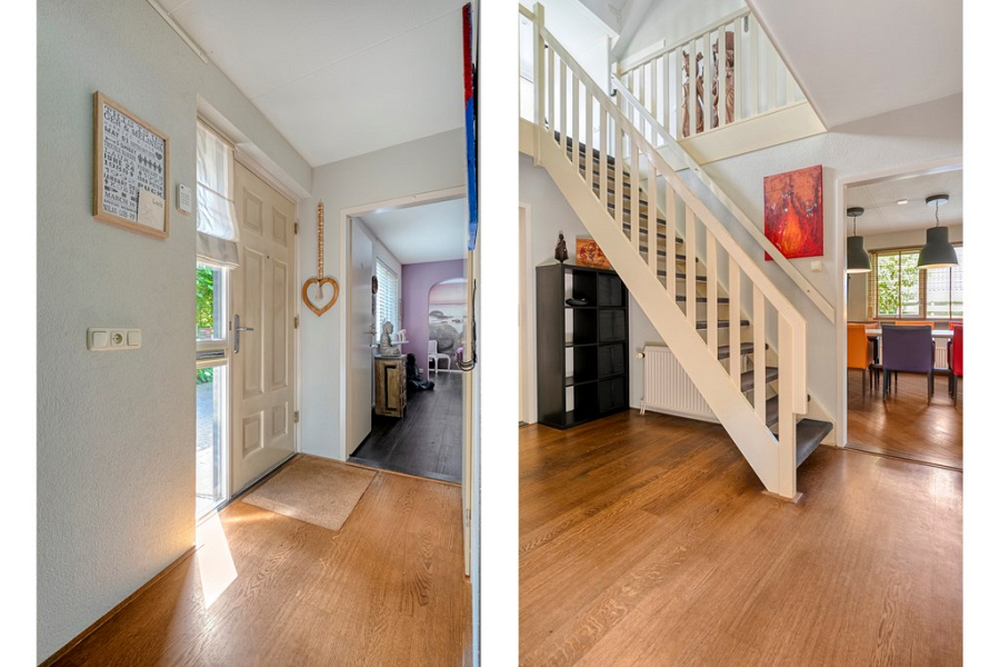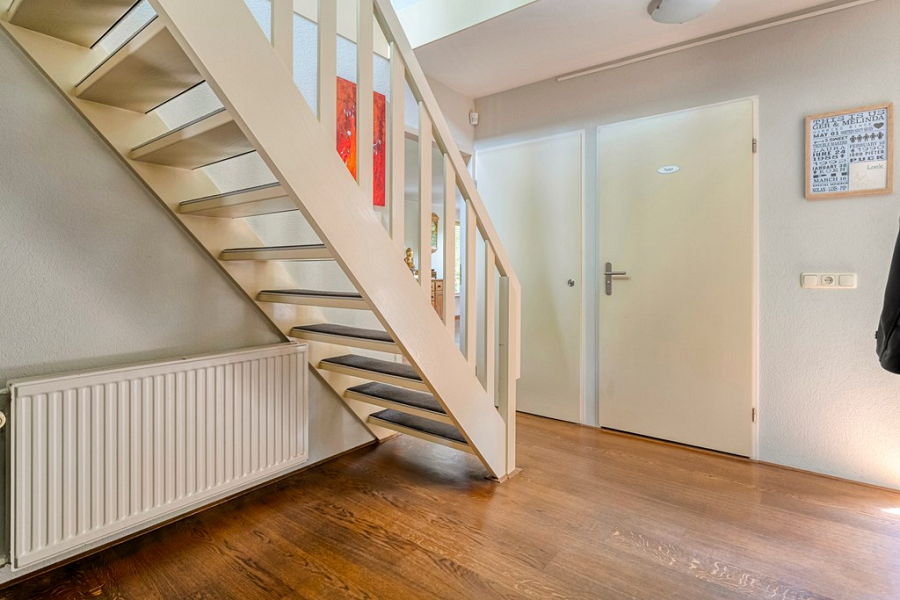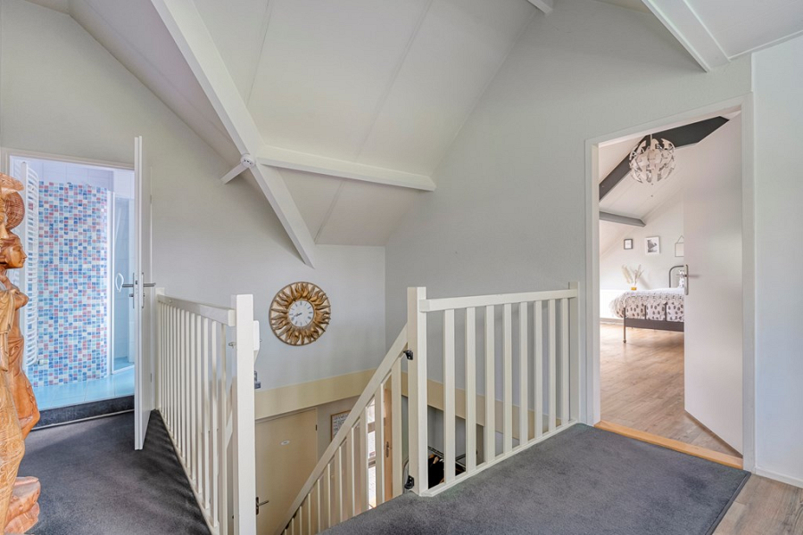 Via de trap in de hal bereik je de verdieping. Op de overloop en één van de slaapkamers is een dakkapel geplaatst, waardoor deze ruimtes extra licht en ruimte krijgen. De overloop beschikt daarnaast over een praktische werkplek en een mooie vide, wat zorgt voor een open en ruimtelijk gevoel.