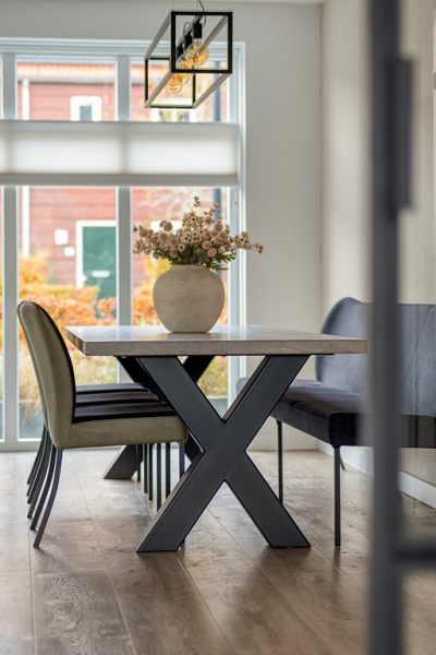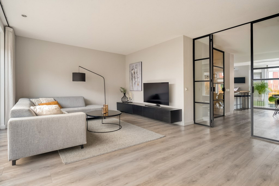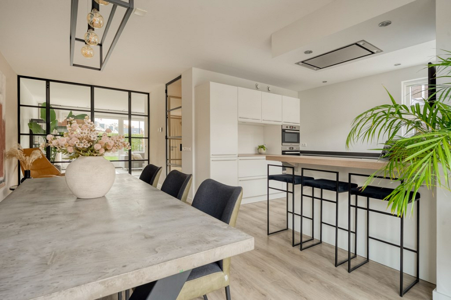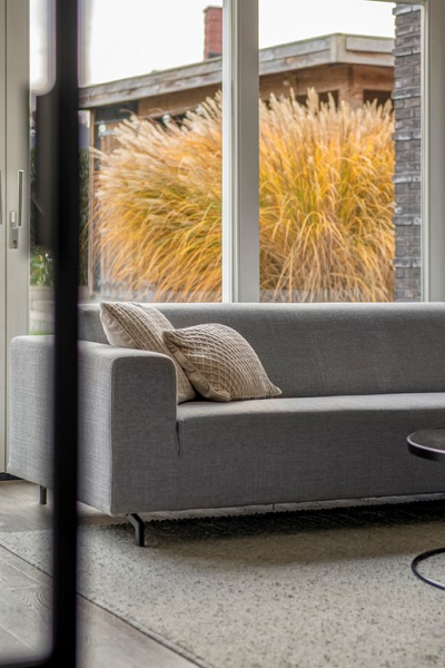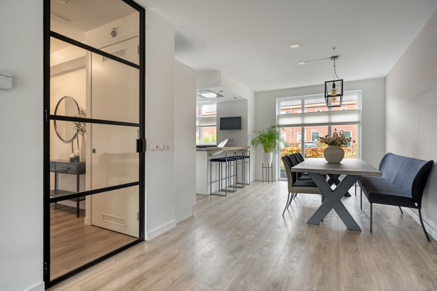 De tuingerichte woonkamer geniet van volop daglicht dankzij de grote ramen en biedt via een schuifpui direct toegang tot het terras. De stalen suitedeuren vormen een stijlvolle scheiding tussen de woonkeuken en woonkamer en geven extra comfort: terwijl de één bezoek heeft aan de keukentafel, kan de ander in de woonkamer rustig een boek lezen en ontspannen. Zo creëer je gemakkelijk een prettige balans voor iedereen in het gezin!