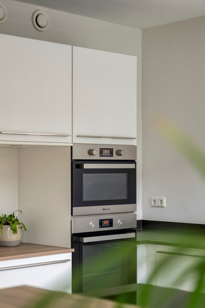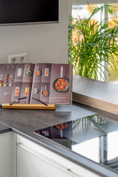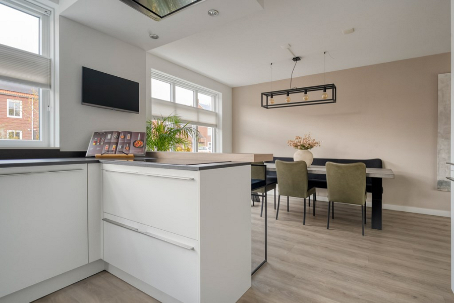 De woonkeuken is een echte ontmoetingsplek: licht, ruim en van alle gemakken voorzien. Zo is er een inductiekookplaat met afzuigkap, vaatwasser, koelkast, kokend water kraan, oven en combi-magnetron. Het schiereiland met bargedeelte nodigt uit om samen te koken of een drankje te doen en er is meer dan genoeg ruimte voor een grote eettafel, perfect voor gezellige diners met vrienden of familie.
