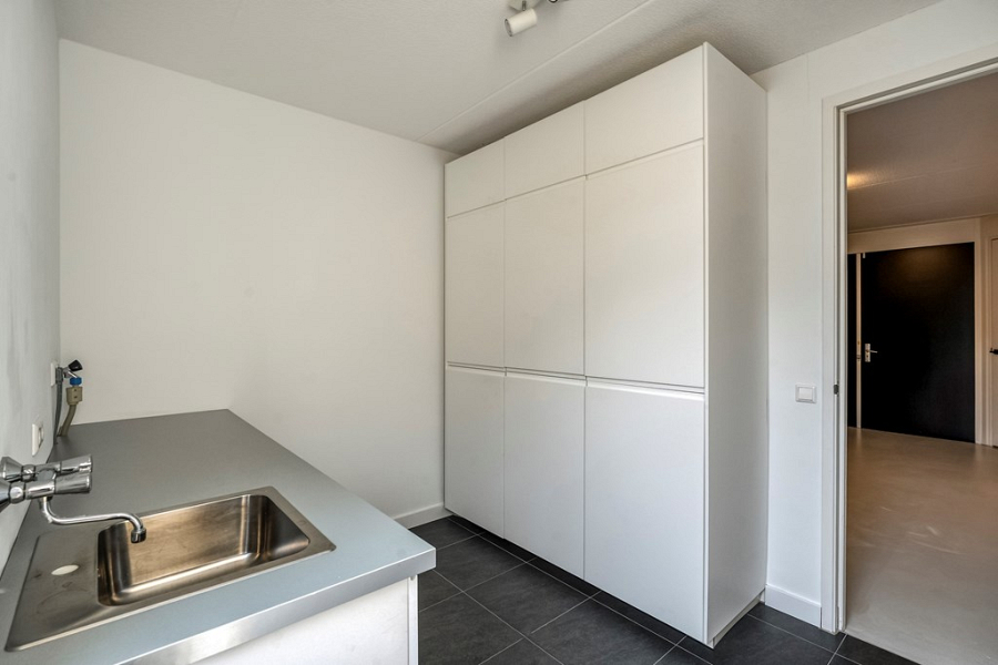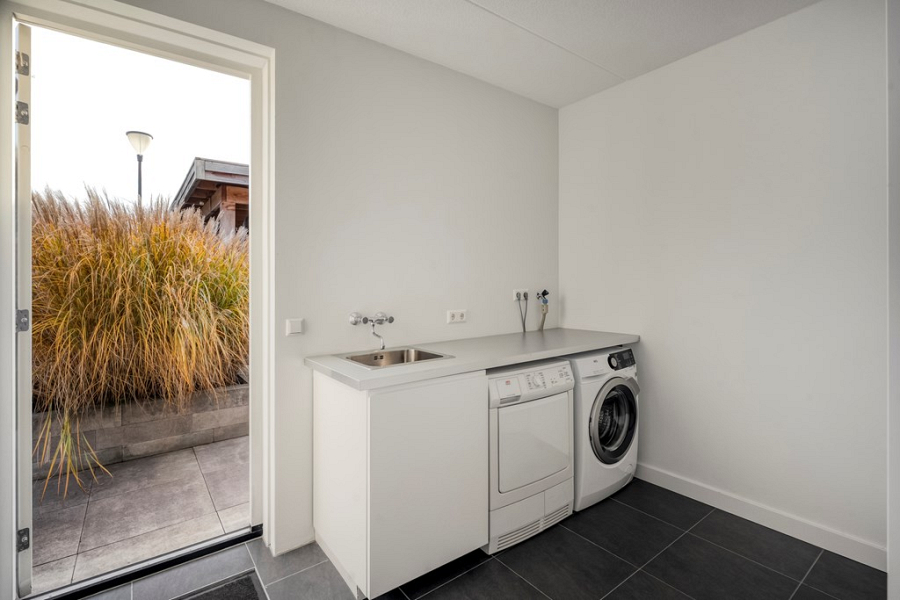 Vanuit de berging loop je naar de bijkeuken, voorzien van een keukenblok met warm en koud water, aansluitingen voor wasmachine en droger, een ruime inbouwkast en een vriezer. Vanuit de bijkeuken is er direct toegang tot de achtertuin, wat het dagelijks gebruik extra praktisch maakt.