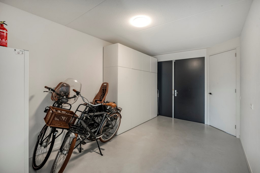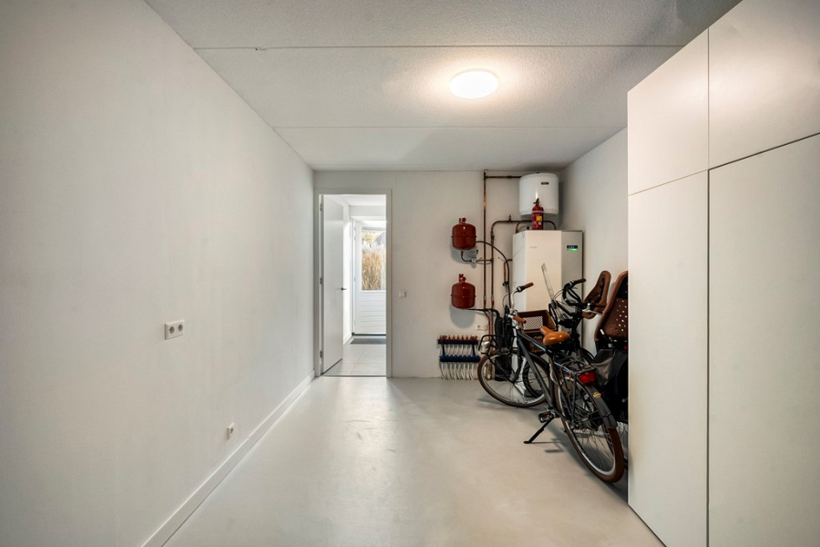 Terug in de hal bereik je de volledig geïsoleerde inpandige berging, die keurig is afgewerkt met gestucte wanden en een gecoate betonvloer. Er is voldoende ruimte voor het stallen van fietsen en andere opbergruimte, hier bevindt zich ook de installatie van de bodemwarmtepomp.