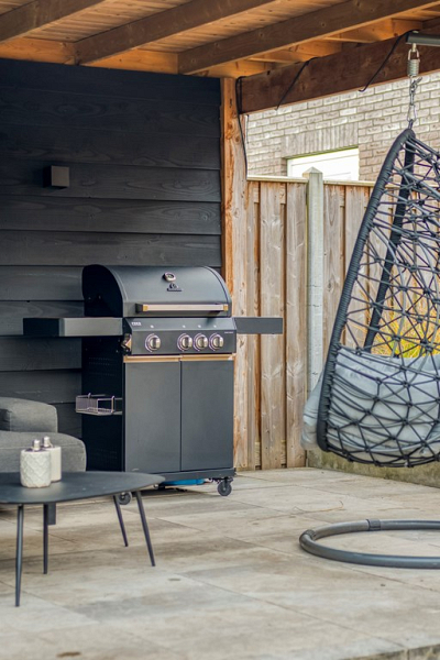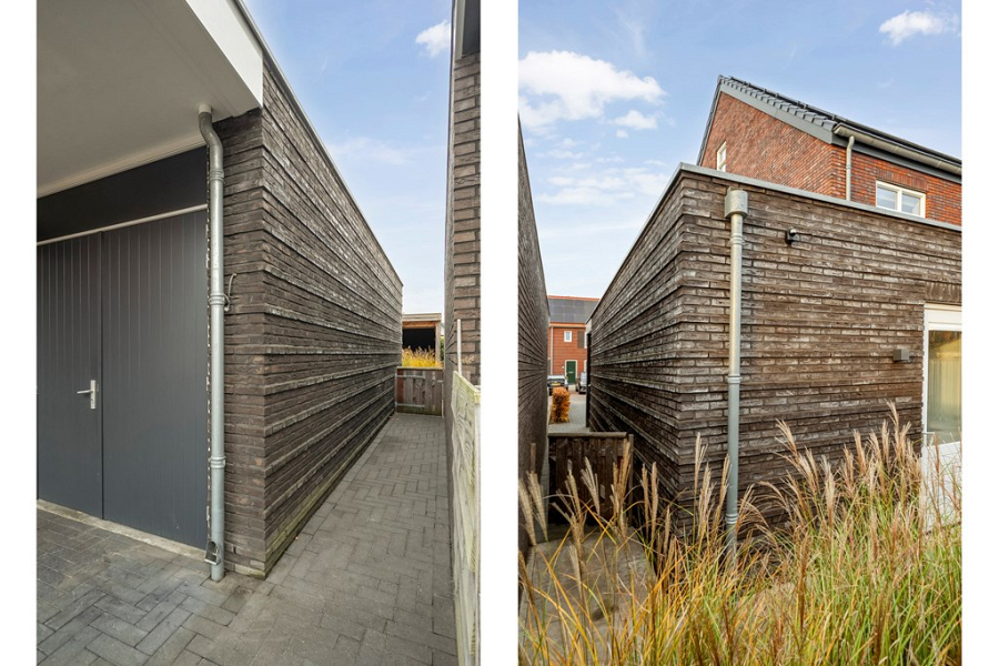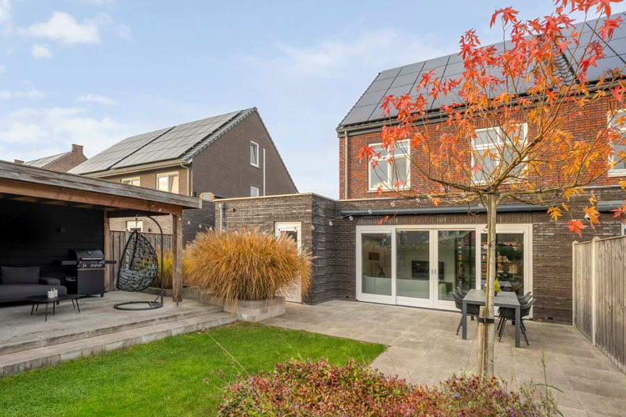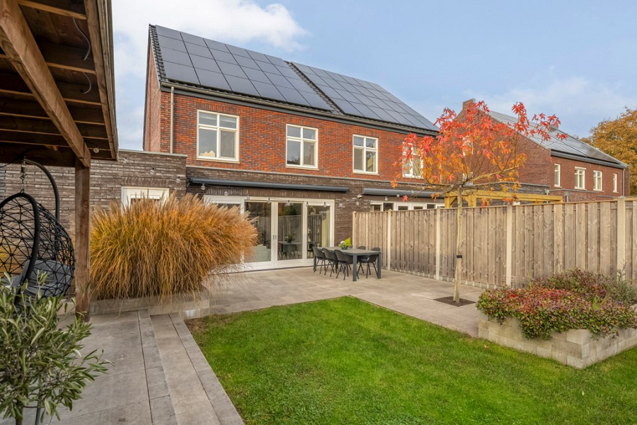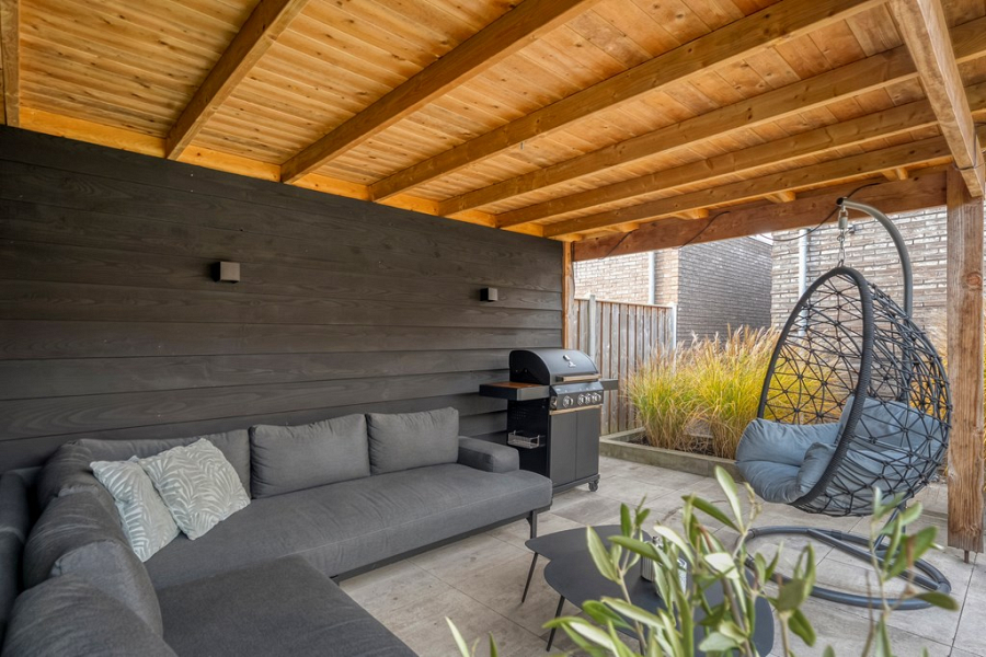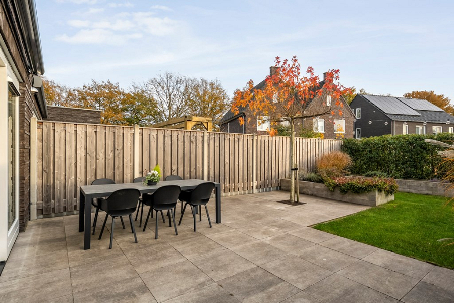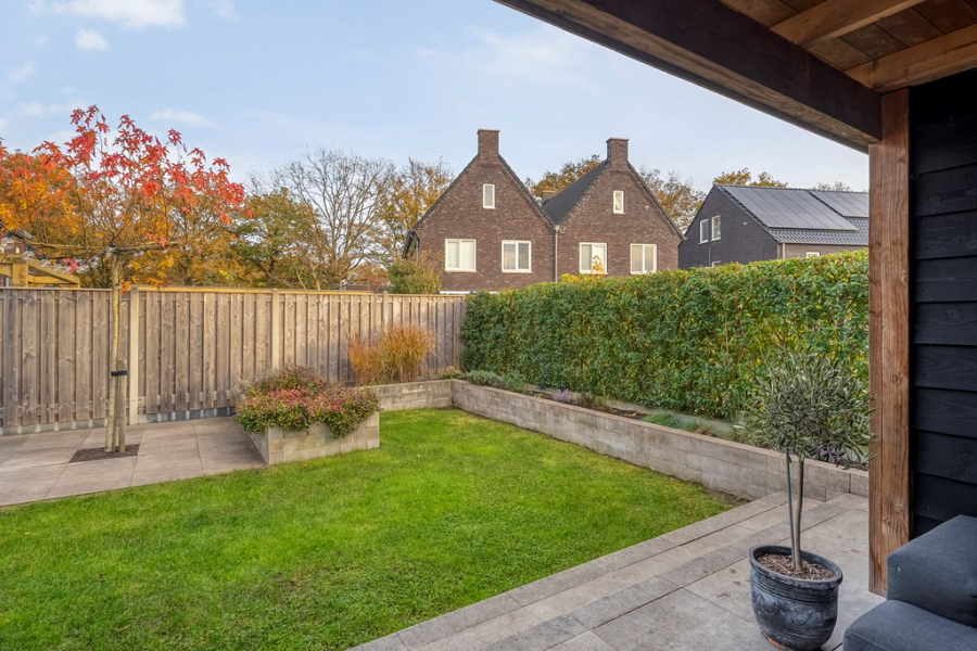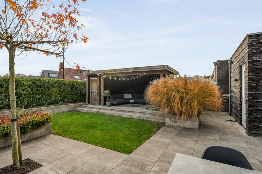 De achtertuin ligt op het zuiden, is met veel oog voor detail onder architectuur aangelegd en beschikt over een handige achterom. Je vindt er een fraaie overkapping, ideaal om op zonnige of juist iets koelere dagen te genieten en een extra houten berging voor het netjes opbergen van tuinspullen en kussens. Dankzij de vrije ligging aan de achterzijde ervaar je hier volop rust en privacy, zonder inkijk van buren. Een perfecte plek om te barbecueën met vrienden, te genieten van de zon of gewoon lekker buiten te ontspannen.
