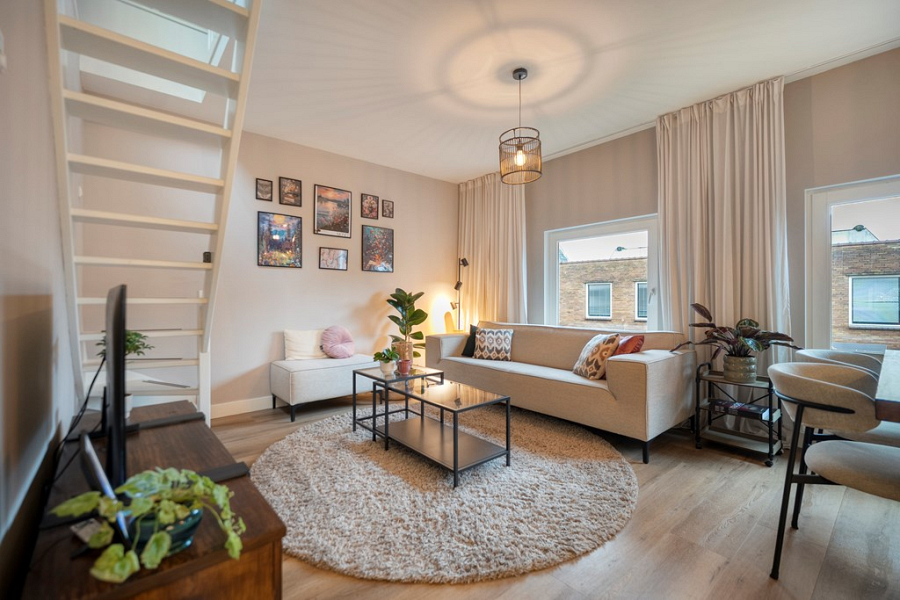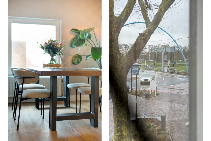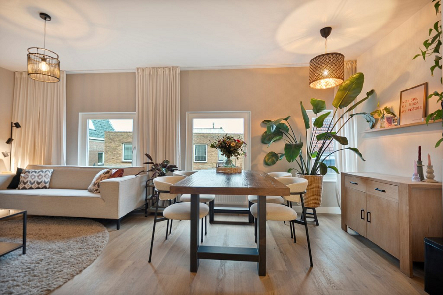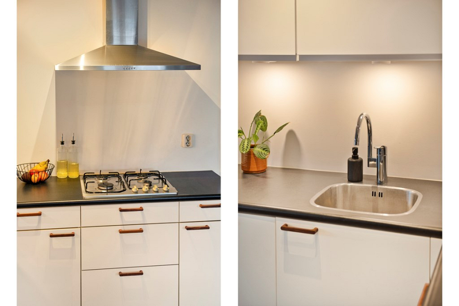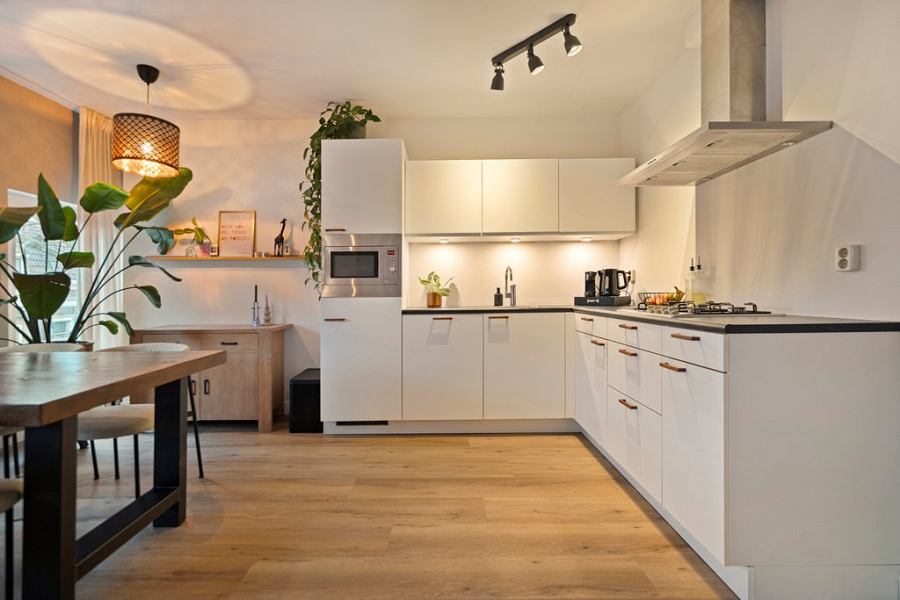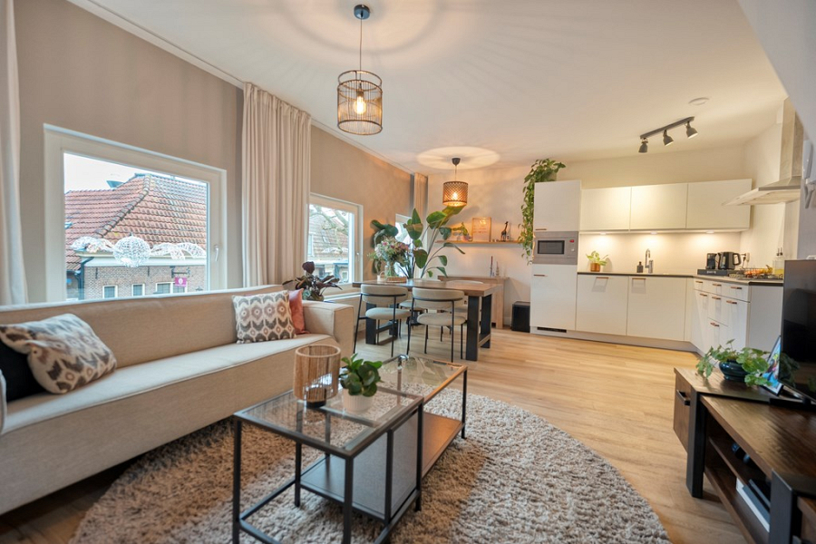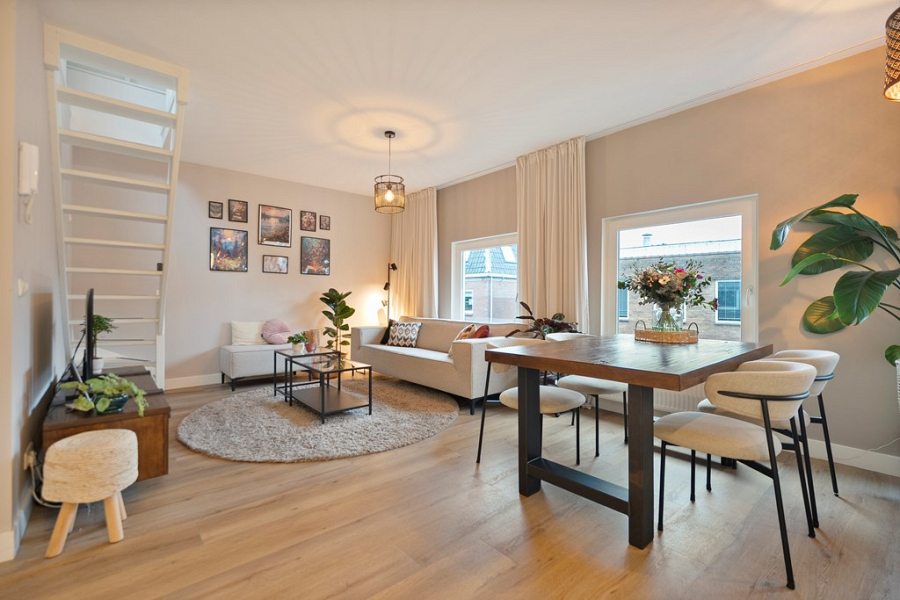 De hal loopt door naar de sfeervolle woonkamer, waar de grote raampartijen zorgen voor veel lichtinval en een open, prettige uitstraling. Dankzij het uitzicht op de Prinsenstraat voelt de ruimte levendig, terwijl er binnen juist een fijne plek ontstaat om te wonen en te ontspannen. De open keuken sluit hier goed op aan en is uitgerust met een 4-pits gasfornuis, afzuigkap, vaatwasser, koelkast met vriesvak en combimagnetron.