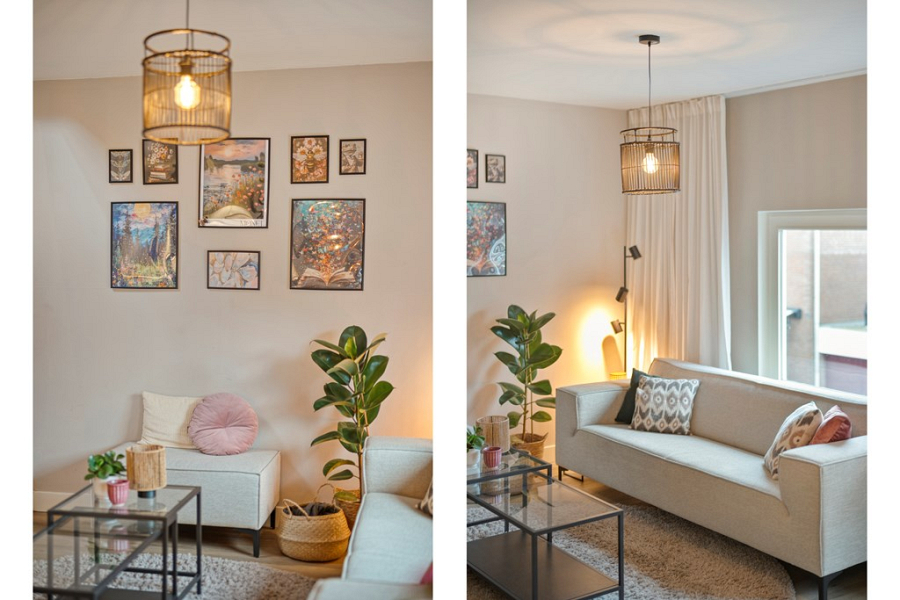 -Sfeervolle woonkamer met grote raampartijen, veel lichtinval en uitzicht op de winkelstraat