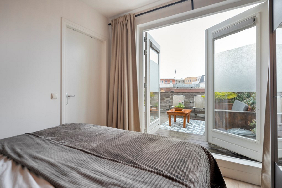 Via het dakterras bereik je de entree en kom je in de hal, die toegang geeft tot alle vertrekken op deze woonlaag. Aan de linkerzijde ligt de slaapkamer, met dubbele deuren naar het dakterras.