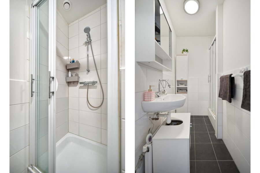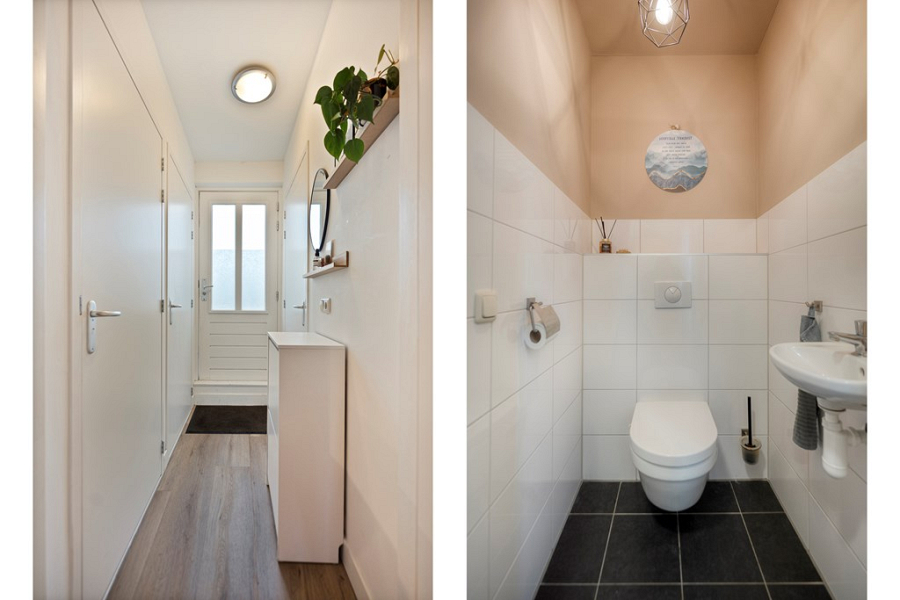 Verder geeft de hal toegang tot het moderne toilet met fontein en de badkamer met douche en wastafel. Alles strak en functioneel ingericht.