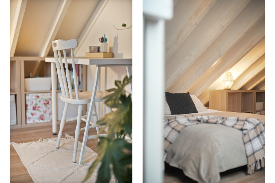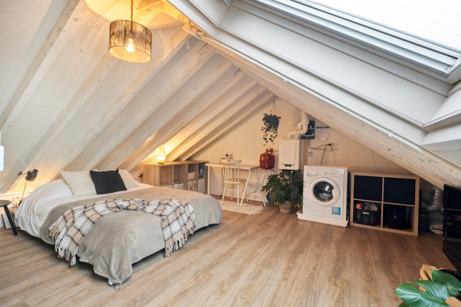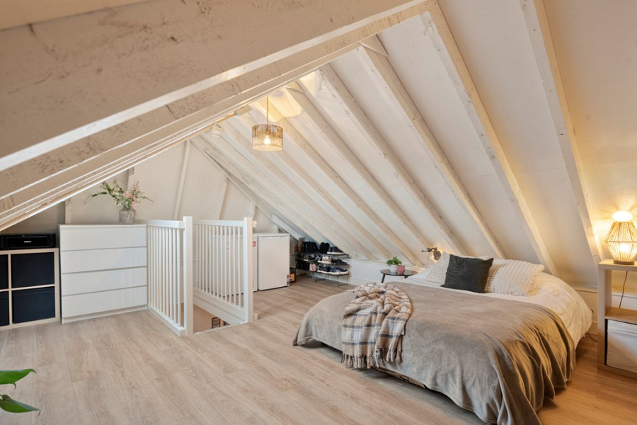 In de woonkamer zorgt de open trap voor een speels en ruimtelijk effect. Deze brengt je naar de verdieping: een volwaardige extra ruimte met een stahoogte van circa 2,17 meter en een Velux dakvenster voor prettig daglicht. Deze ruimte kan gebruikt worden als slaapkamer, maar ook zeer geschikt als werkruimte. Hier bevinden zich daarnaast de cv-opstelling (Remeha 2015) en de wasmachineaansluiting.
