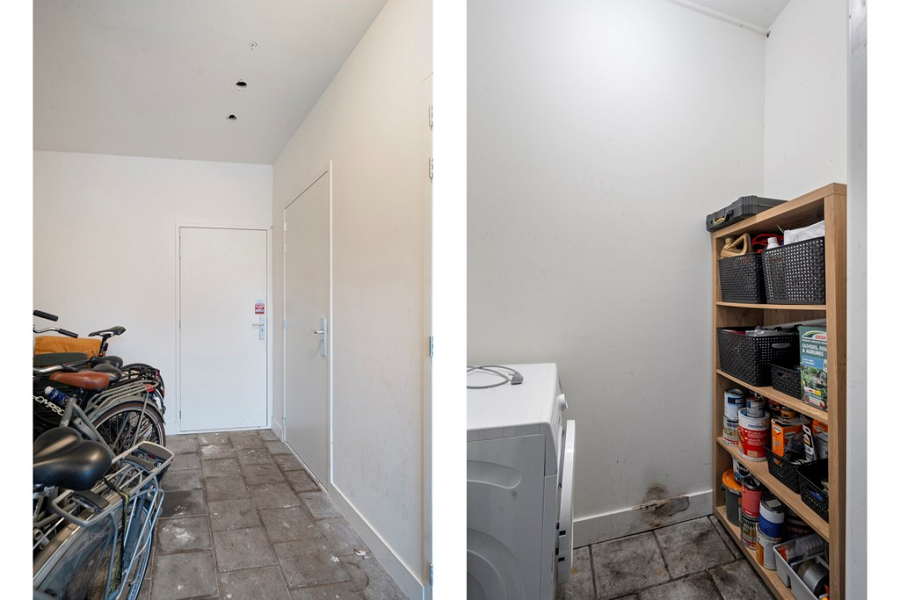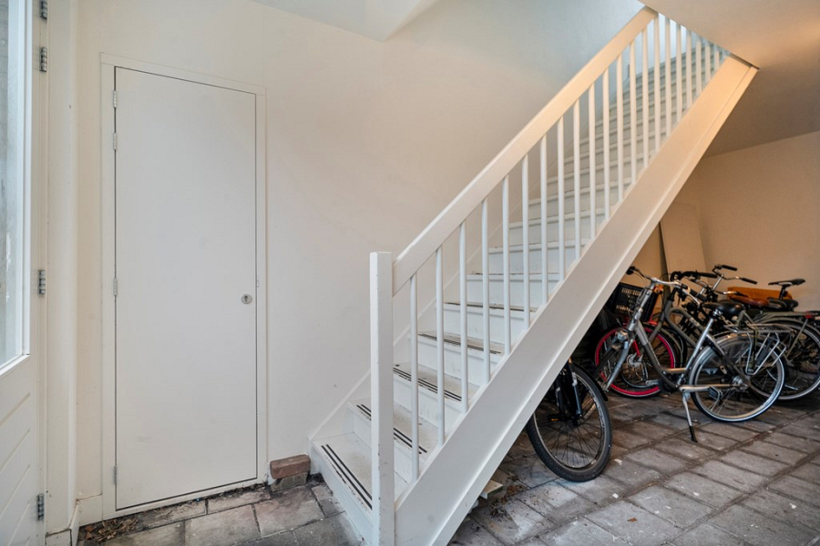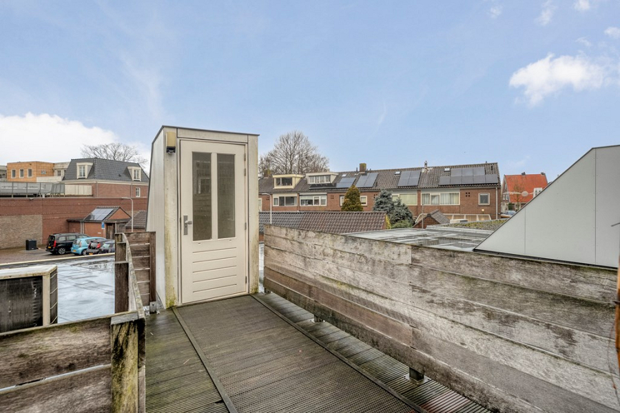 De entree bevindt zich aan het pleintje aan de Beltestraat en is afgesloten met intercom en voorzien van brievenbussen. In de centrale hal is ruimte om een fiets te stallen en daarnaast beschikt het appartement over een eigen bergkast. Boven aangekomen, via de afgesloten trapopgang, ontdek je meteen het grootste pluspunt: een gezellig dakterras op het westen. Het terras is netjes aangelegd met vlonders en biedt genoeg ruimte voor een zithoek. Een fijne plek om na een werkdag buiten te zitten of om in de avond nog even van de zon te genieten, zeker uniek voor een appartement midden in het centrum.