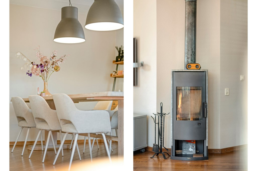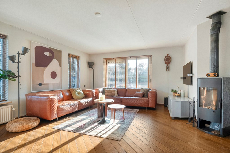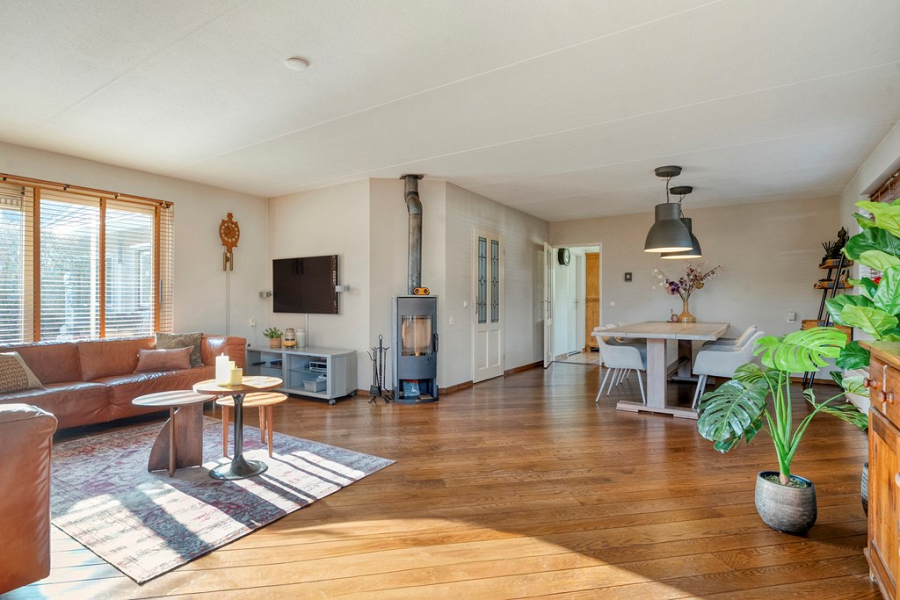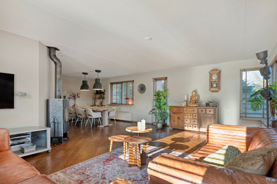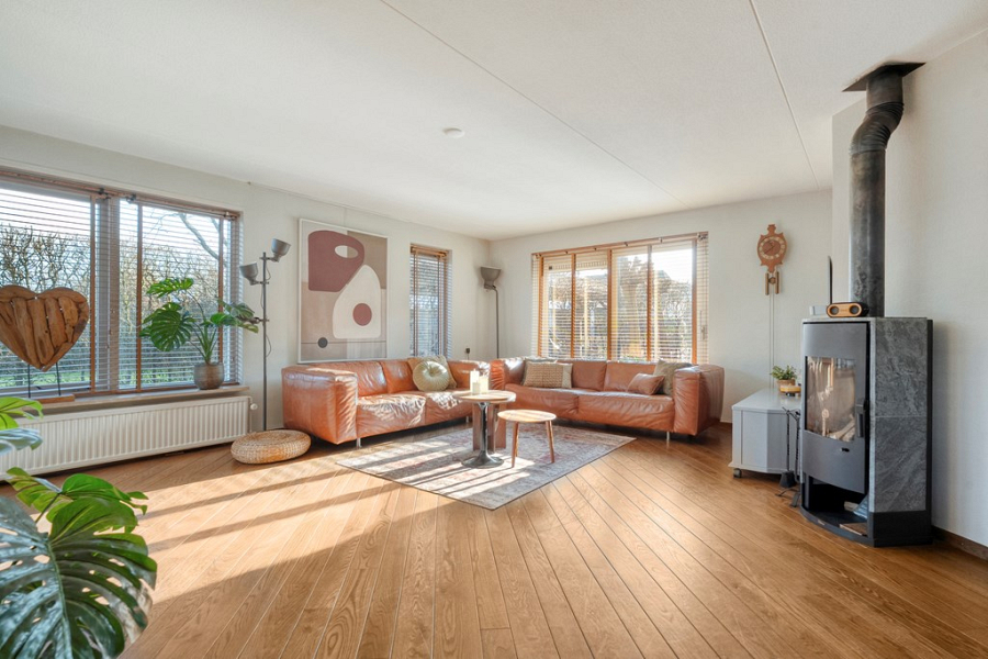 De royale en lichte woonkamer is voorzien van een sfeervolle speksteenkachel, eiken houten vloer en een schuifpui naar de tuin, waardoor je hier volop geniet van het binnen-buitengevoel. Er is meer dan genoeg ruimte voor een gezellige zithoek en een grote eettafel, perfect voor lange avonden met familie en vrienden.