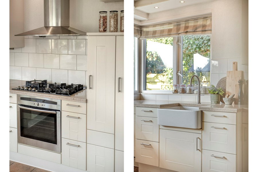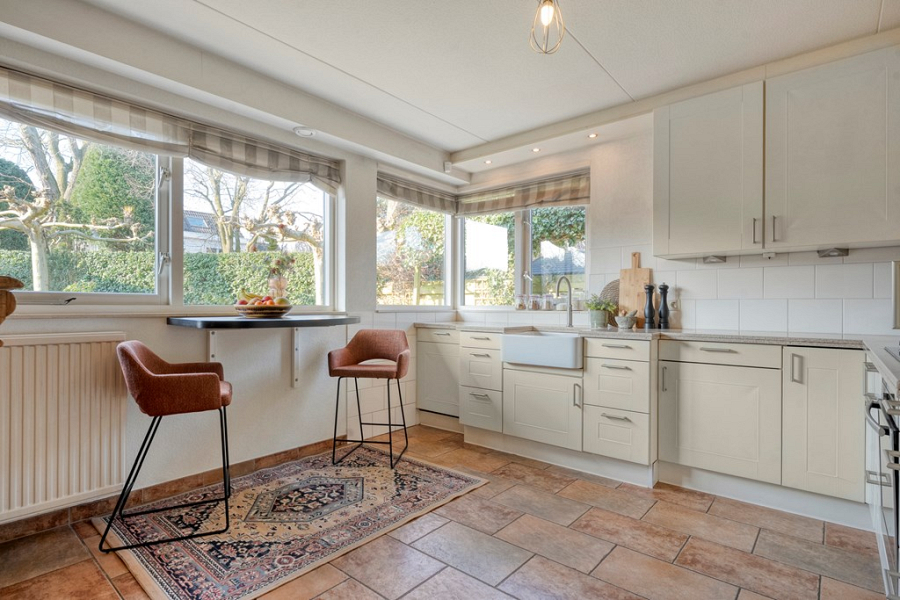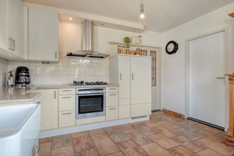Aan de achterzijde van de woning ligt de dichte keuken, met uitzicht op de tuin. De keuken is functioneel en voorzien van diverse inbouwapparatuur en biedt volop mogelijkheden om deze geheel naar eigen smaak en stijl te moderniseren.