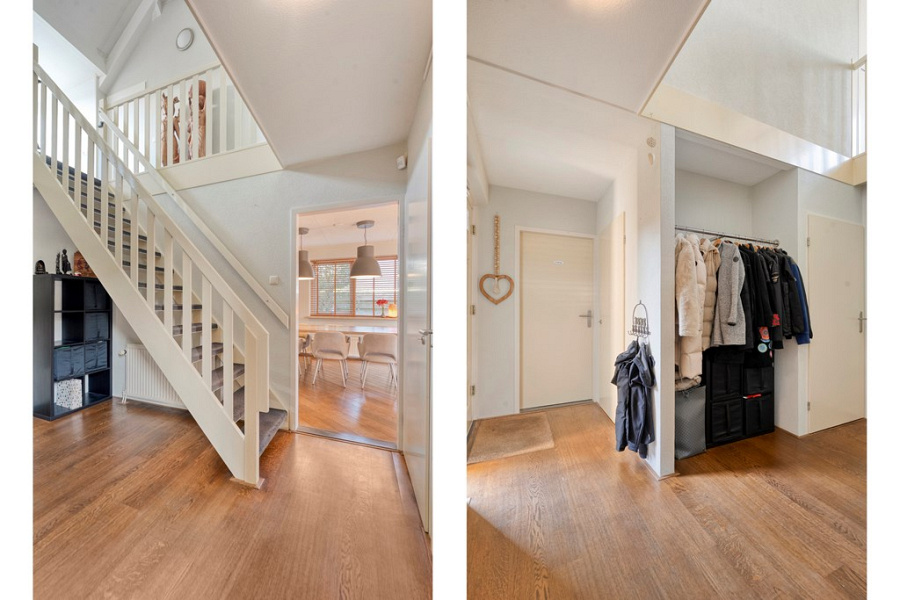 Via de trap in de hal bereik je de verdieping. Op de overloop en één van de slaapkamers is een dakkapel geplaatst, waardoor deze ruimtes extra licht en ruimte krijgen. De overloop beschikt daarnaast over een praktische werkplek en een mooie vide, wat zorgt voor een open en ruimtelijk gevoel.